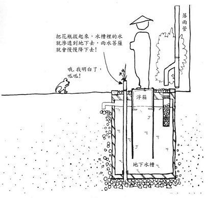 這是一幅節錄自「雨水利用百寶箱」書中的小構想,淑娟拿來跟我們分享,很有學堂親民的概念。