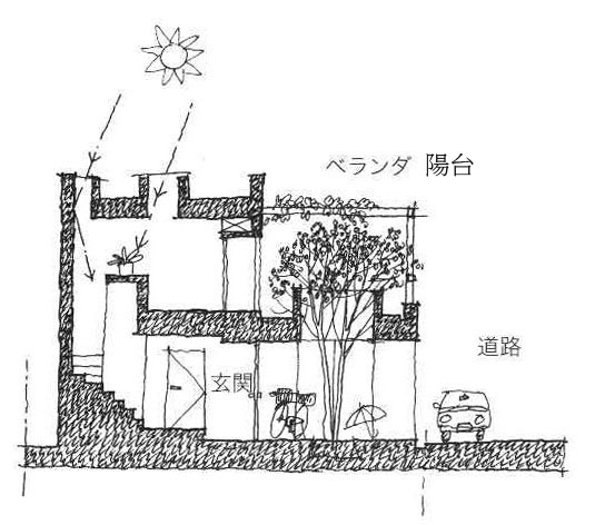 ►道路及住宅的剖面圖 一樓是開放式空間,二樓是陽台。