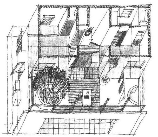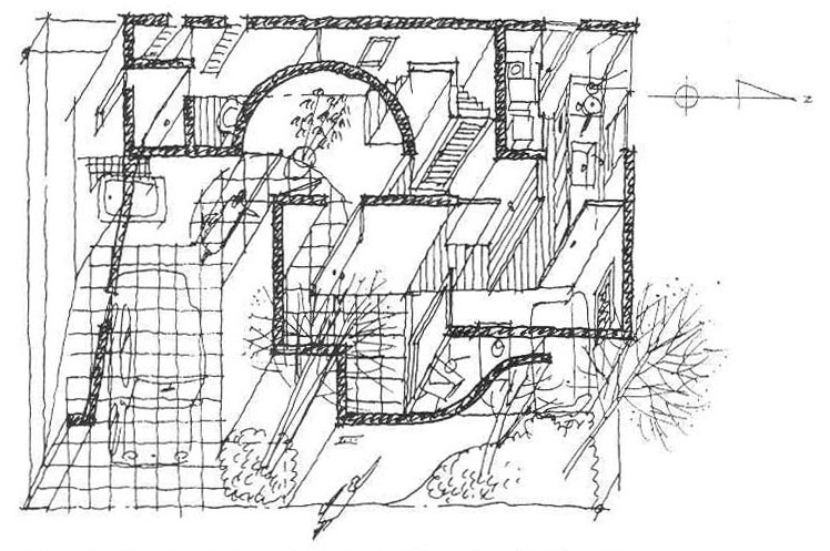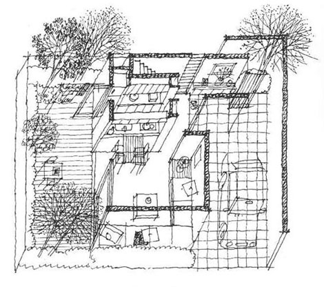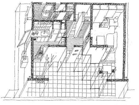 例舉一個不斷修改設計的住宅,原先的第一案(頁12)與第二案就是滿溢了許多需求的住宅。我想你能明白當這些相當豐富的空間都無法割捨,而臥房、廚房、飯廳等就會變得非常狹窄。