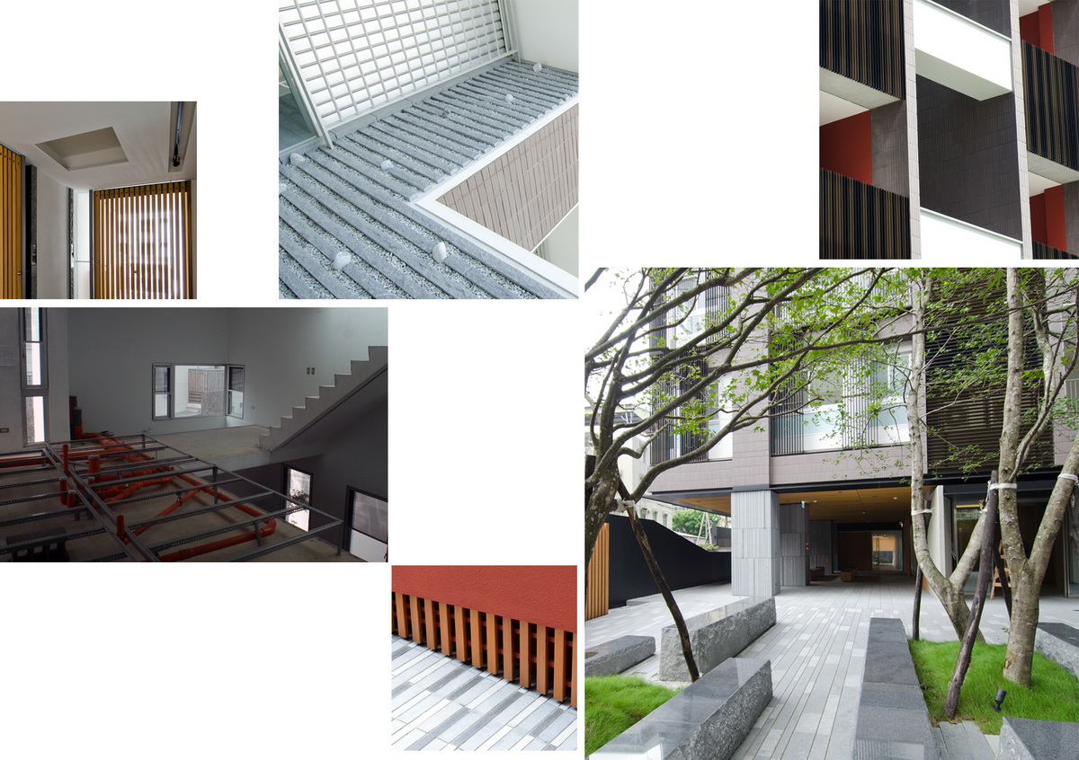 丁掛磚開發、滑動格柵研發、雨遮框架整合、玄關門設計、信箱設計、設備門柱整合、制音地板及地板插座整合、重點空間實木家具設計。