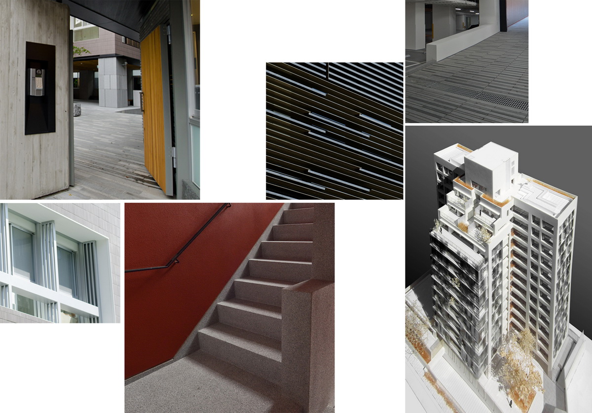 外牆材質介面整合、安全梯細部整合、降版配管提案、磁磚計畫、地坪計畫、廚房衛浴陽台等用水空間細部檢討(詳細設計圖非指施工圖)。